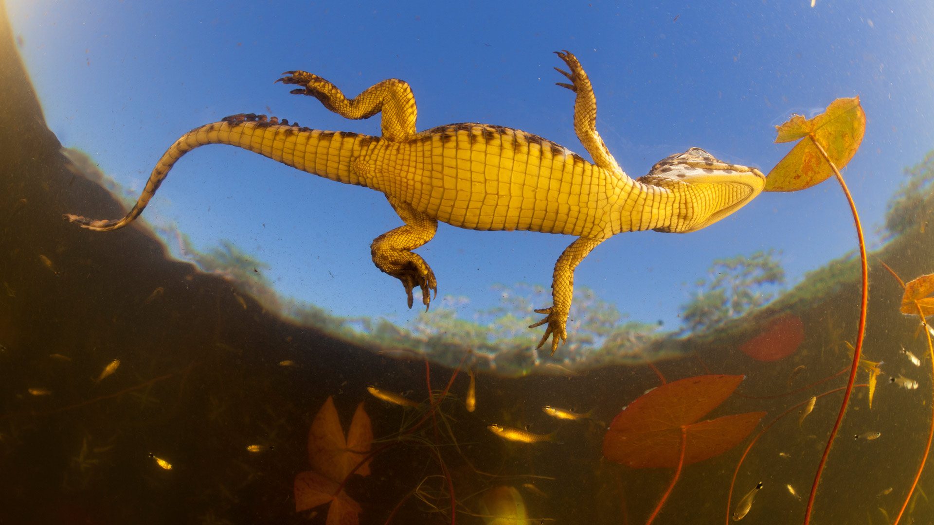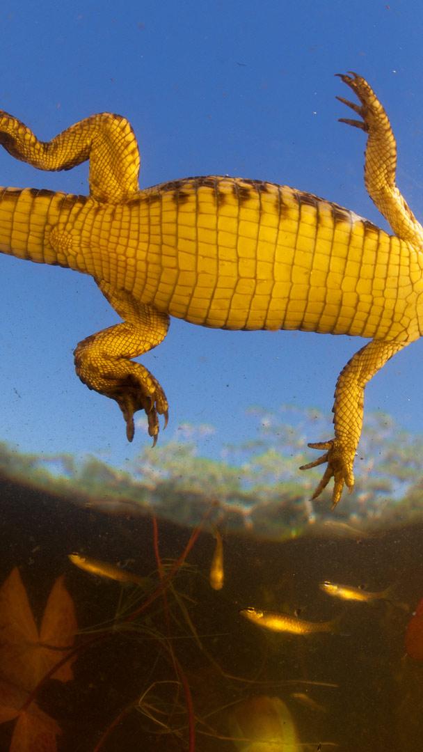 Lentes para um mergulho especial Jacaré (Caiman yacare) bebê visto de baixo (© Luciano Candisani/Minden Pictures)