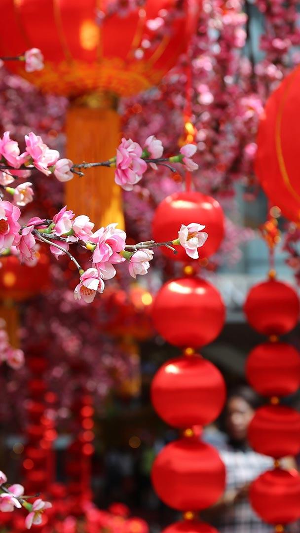 春节快乐,兔年大吉! 春节的桃花和红灯笼 (© David Ng+EyeEm/Getty Images)