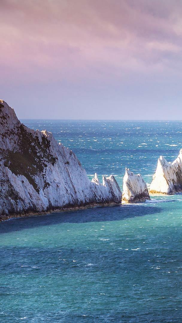 看起来很锋利的岩石 英格兰怀特岛上的尼德尔斯白垩岩石和19世纪的灯塔。 (© CBCK Christine/iStock/Getty Images Plus)