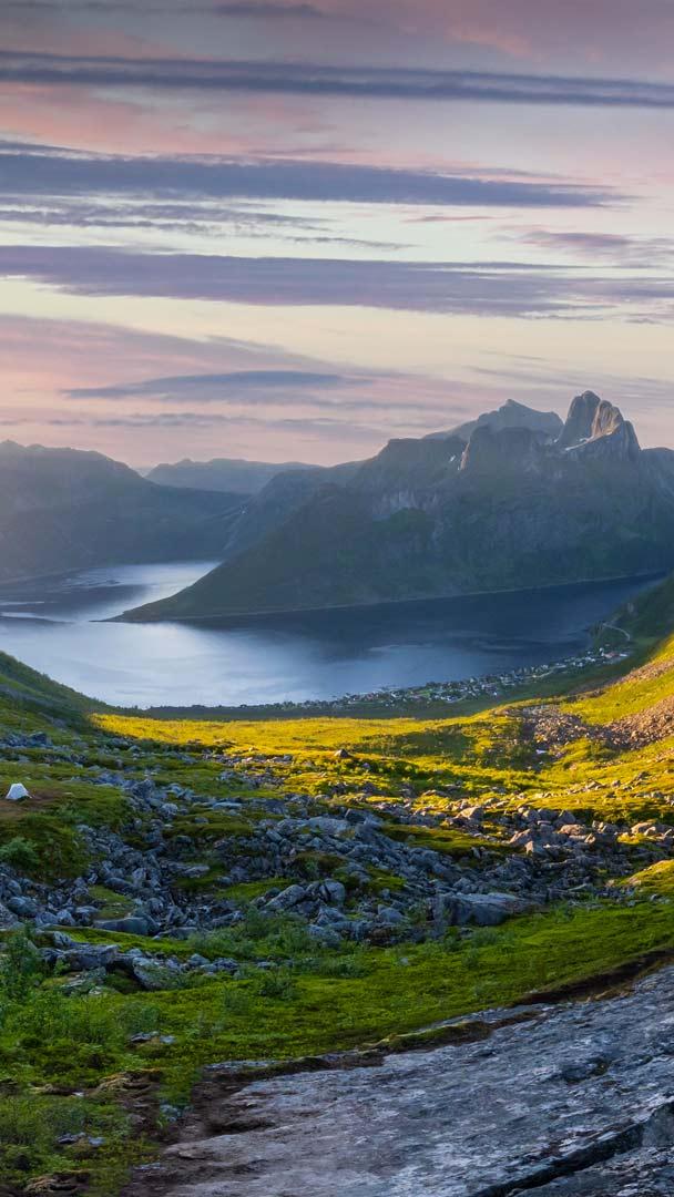 Senja ist eine zauberhafte Insel, die im norwegischen Volksmund auch als „Norwegen im Kleinformat“ bezeichnet wird. Sie erstreckt sich über etwa 1.590 km² und ist somit die zweitgrößte Insel des Landes. Die Gisundbrücke verbindet die Insel mit dem Festland in der Stadt Finnsnes. Der Berg Segla ist ein majestätischer Gipfel den man auf einem Wanderweg der in Fjordgård, einem Fischerdorf im Norden von Senja beginnt, besuchen kann. Vor allem im Sommer können Sie hier viele Wanderer treffen.