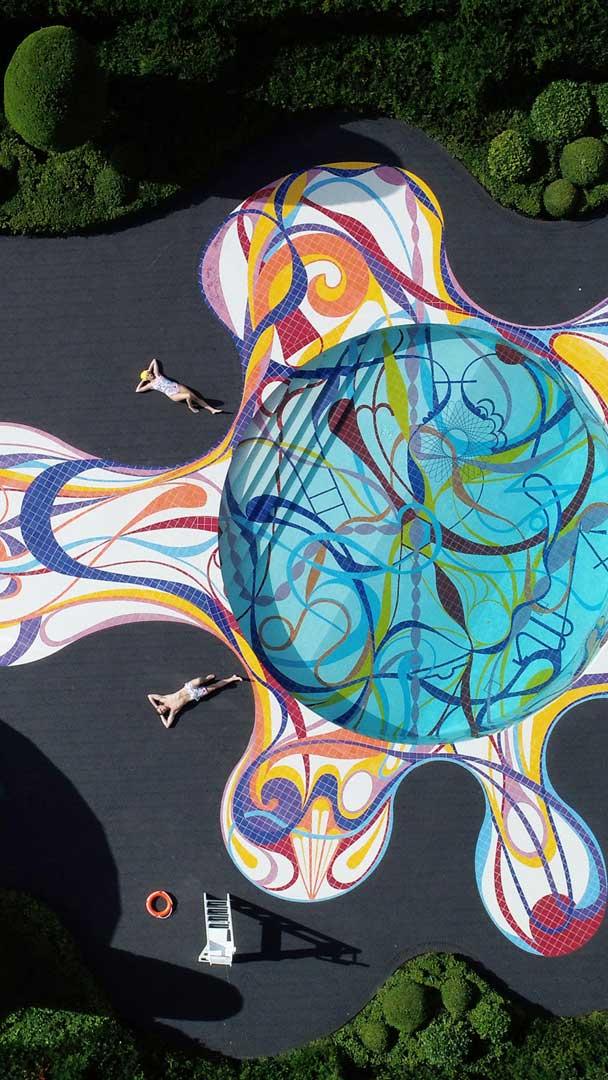 Ein Schwimmbad voller Kunst Schwimmbad „Gateway“ im Jupiter Artland Skulpturenpark, Edinburgh, Schottland (© Owen Humphreys/PA Images/Alamy)
