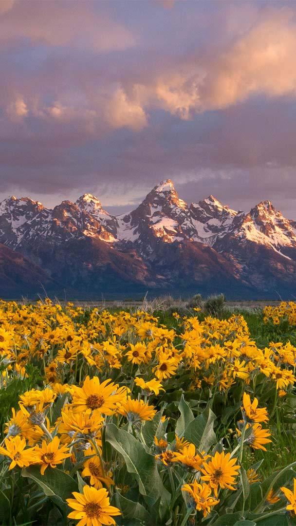 Grandioser Anblick Pfeilblättrige Balsamwurzeln am Fuße der Bergkette Teton Range im Grand-Teton-Nationalpark, Wyoming, USA (© Mike Cavaroc/Tandem Stills + Motion)