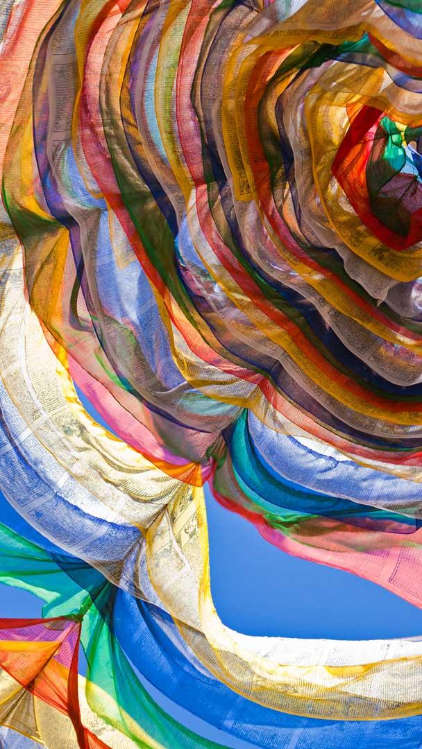 Haben Sie schon mal so ein farbenfrohes Spektakel gesehen? Diese kaleidoskopische Säule besteht aus einer Reihe von Gebetsfahnen, die vom Wind im Phobjikha-Tal in Bhutan bewegt werden. Die Gebetsfahnen, typisch für die buddhistische Religion, werden normalerweise entlang einer Linie mit fünf sich wiederholenden Farben aufgehängt. Jede Farbe stellt ein Element der Natur dar. Normalerweise wird dieses heilige Gewebe mit seinen spirituellen Inschriften an Tagen des Wohlstands gehisst, wie z. B. heute am „Nyinlong“. Es handelt sich dabei um den traditionellen Tag der Sonnenwende in Bhutan. Mit der Zeit verblassen die Fahnen, und die Gläubigen vertrauen darauf, dass dies ein Zeichen dafür ist, dass ihre Gebete erhört wurden und nun vom Wind getragen werden. Ein Wind, der die Umgebung mit Positivität und Spiritualität durchdringt. Beim Anblick der wehenden Gebetsfahnen können wir uns daran erinnern, dass selbst in den dunklen Wintermonaten ein hellerer Morgen am Horizont wartet.