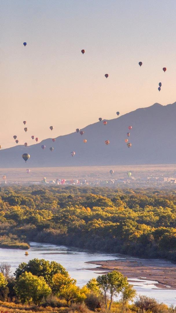 Heißluftballons über dem Rio Grande, Albuquerque, New Mexico, USA © Jennifer MacCornack/Shutterstock