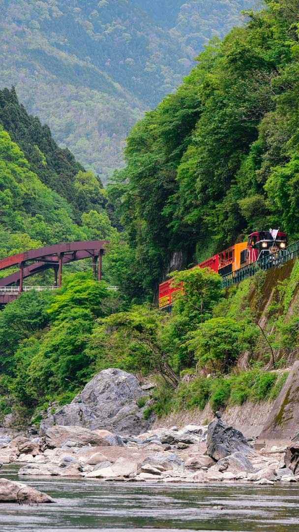 Un tren a lo largo del río Hozugawa, Arashiyama, Japón © Alvin Huang/Getty Images