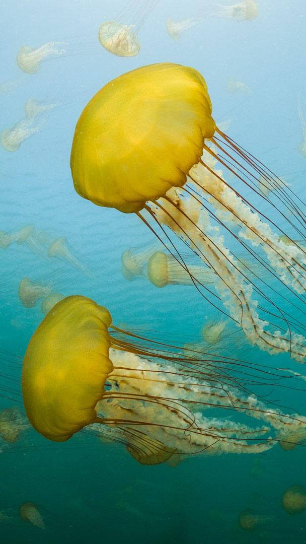 ¡Hoy es el Día Mundial de las Medusas! Las medusas pueden observarse en todos los océanos del mundo en una gran variedad de formas y tamaños. Hay unas 2.000 especies diferentes de medusas, y todas carecen de corazón, huesos y cerebro. Las medusas ortiga del Pacífico, que se ven aquí, son conocidas por su vibrante campana de color marrón dorado y sus largos tentáculos. Estas criaturas desempeñan un papel vital en la cadena alimentaria del océano, ya que son la principal fuente de alimento para muchos animales marinos, incluidas las tortugas marinas. Las medusas están amenazadas por el cambio climático, la contaminación marina y la sobrepesca, y los daños que sufren sus poblaciones repercuten en la vida marina que depende de ellas. En España, podemos encontrarnos con frecuencia con varias especies inofensivas o venenosas, entre ellas, las más comunes son medusa de huevo frito, medusa luminiscente, aguamala, Aurelia aurita o carabela portuguesa entre otras.