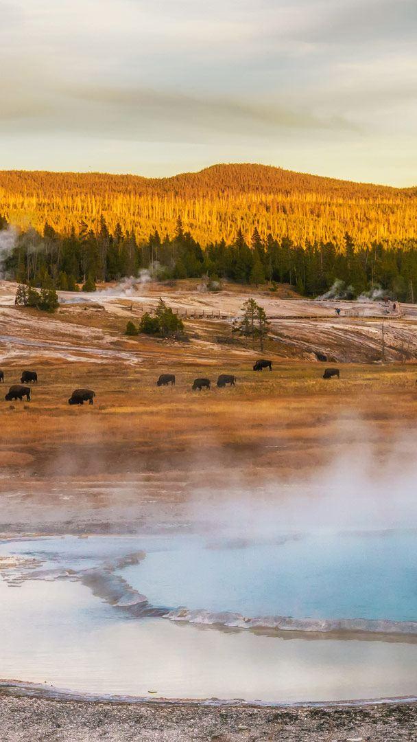 Bisontes pastando, Parque Nacional de Yellowstone, Wyoming, EE. UU. © Cheryl Ramalho/Getty Images