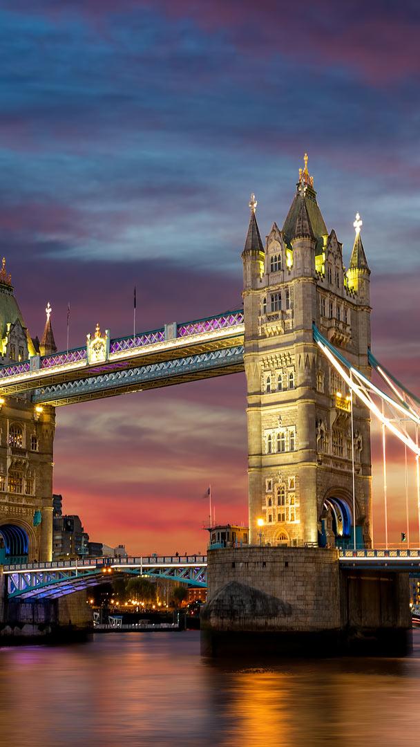 Algunos puentes solo conectan dos lados, pero Tower Bridge une historia, ingeniería y un toque de dramatismo. Situado junto a la Torre de Londres y sobre el río Támesis desde 1894, este icono de Londres destaca tanto por sus torres gemelas y su pintura azul y blanca como por sus impresionantes basculantes que se elevan para dejar pasar los barcos.