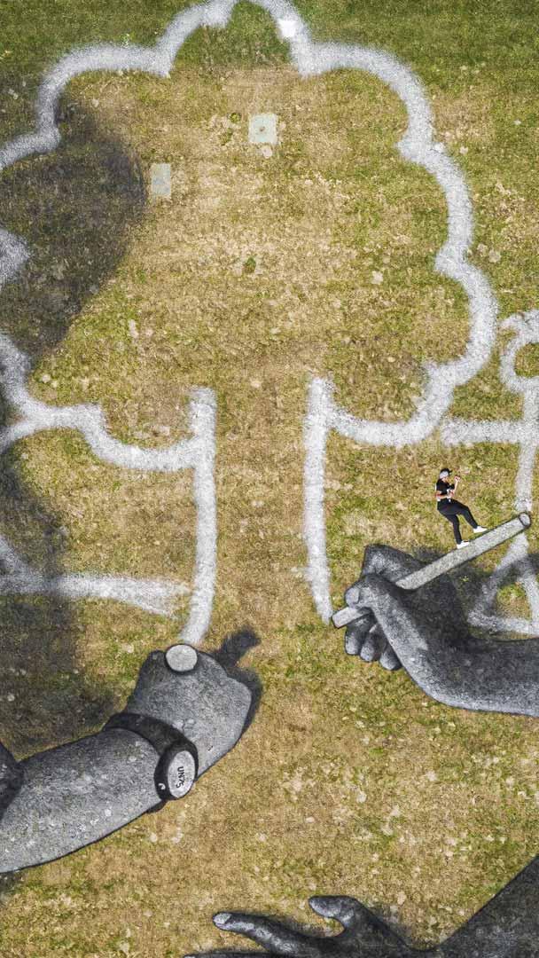 En el césped de la sede de las Naciones Unidas en Ginebra, dos niños se inclinan sobre una página en blanco, dibujando el mundo tal como sueñan que podría ser. Esta escena forma parte de World in Progress, una monumental obra de land art creada en 2020 por el artista suizo-francés Saype. Realizada con pintura biodegradable, representa la visión y la inocencia que inspiran el Día Mundial del Niño. Observando de cerca, incluso se puede ver al propio artista posando junto a su obra.