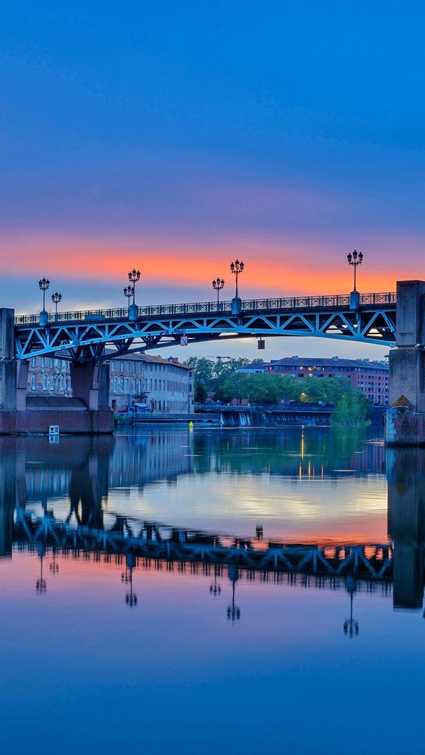 Lorsque le soleil se couche sur la Garonne, Toulouse dévoile l’un de ses plus beaux panoramas : le pont Saint-Pierre et le majestueux dôme de la Grave se reflétant dans l’eau. Ce pont, reliant les deux rives de la Ville Rose, a été construit en 1849, puis reconstruit en 1927 et en 1987 pour s’adapter aux besoins modernes.