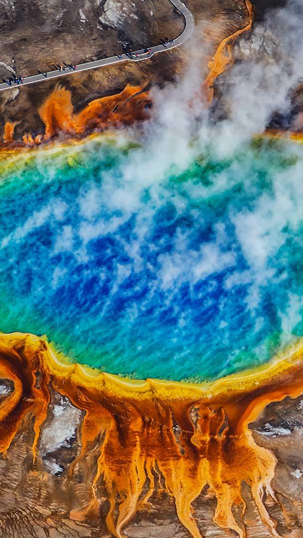 Dans le parc national de Yellowstone, au cœur du Wyoming aux États- Unis, une source d’eau bouillante dessine ce cercle aux couleurs irréelles. La Grand Prismatic Spring, avec ses dégradés de bleu, de vert, d’orange et de rouge, est la plus grande source chaude du pays. Elle mesure environ 110 mètres de diamètre et 50 mètres de profondeur. La température de l"eau au centre de la source est d"environ 70 °C, ce qui rend cette zone stérile en raison de la chaleur extrême. Les couleurs vives sont dues à des tapis microbiens de bactéries thermophiles qui vivent autour des bords de l"eau riche en minéraux.