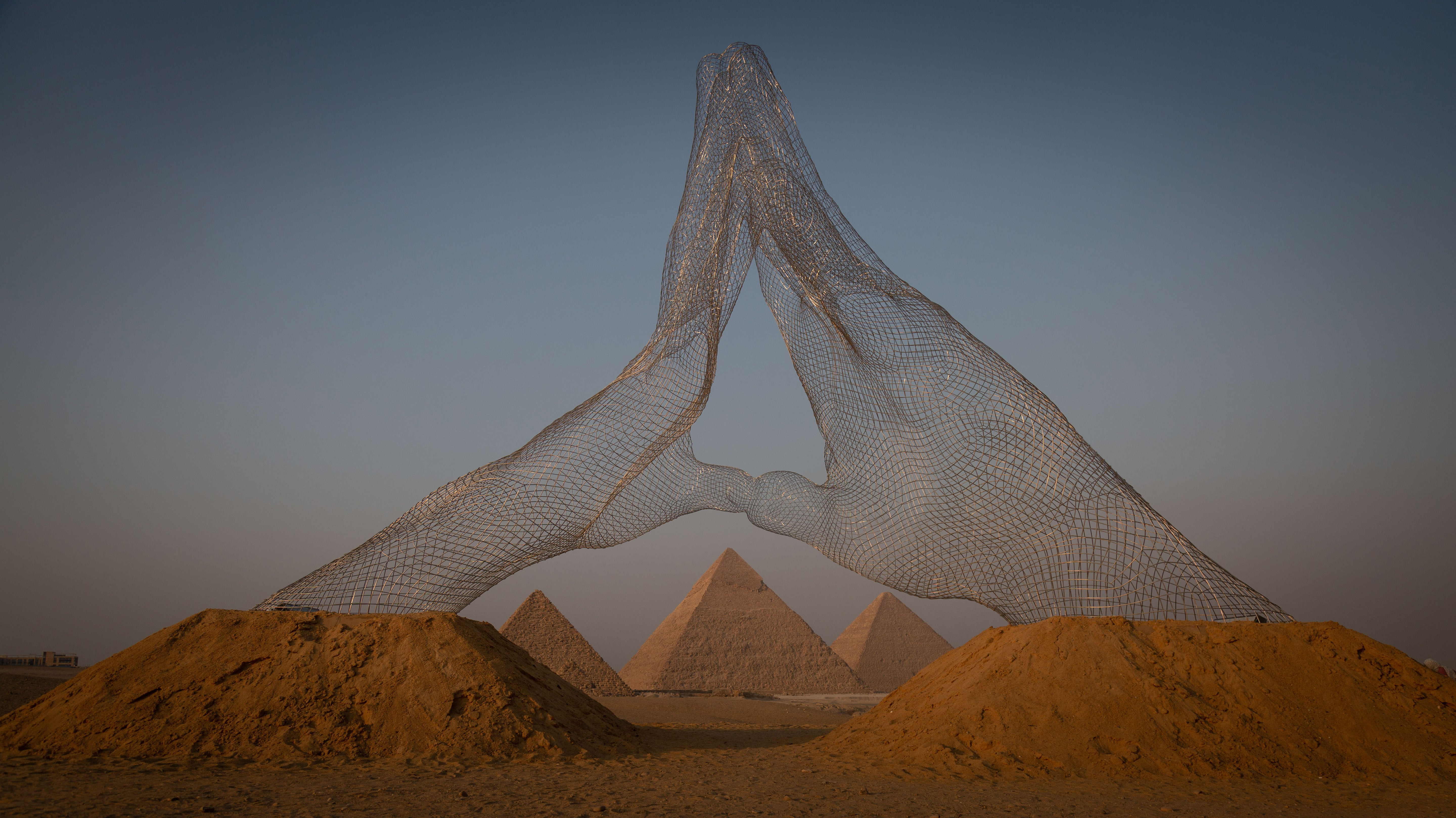 Quand lart imite la vie ‘Together’ de Lorenzo Quinn, Grandes Pyramides de Gizeh, Le Caire, Égypte (© Sima Diab/Getty Images)