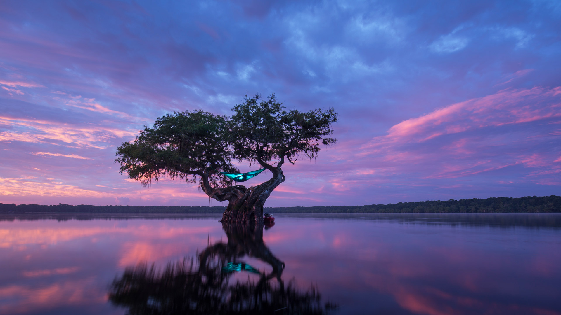En suspens au-dessus de l’eau Hamac campé dans un cyprès chauve, Floride, USA (© Mac Stone/Tandem Stills + Motion)