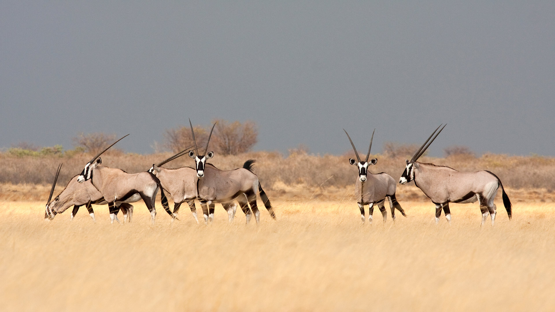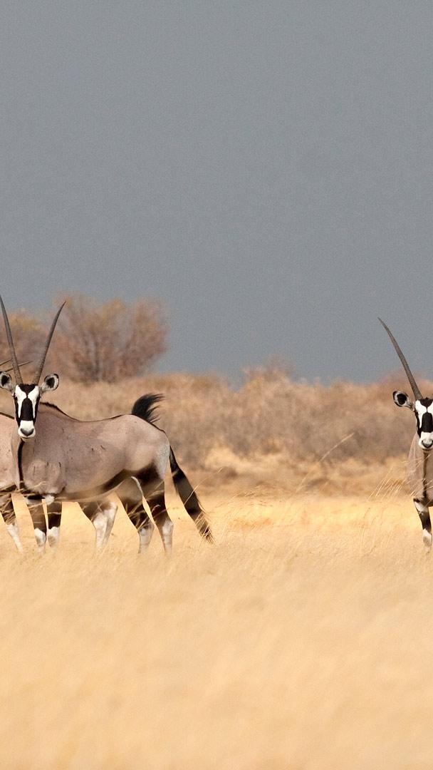 Avec leurs cornes fièrement dressées vers le ciel, voici un groupe d"oryx gazelles qui règne en maître sur les vastes savanes du sud-ouest de l"Afrique. Originaires des régions arides du Botswana, de la Namibie, de l"Afrique du Sud et de certaines parties du Zimbabwe, ils prospèrent principalement dans les déserts du Kalahari et du Namib. Ces antilopes sont capables de survivre pendant des semaines sans eau, en absorbant l"humidité de leur nourriture. De plus, les oryx gazelles sont des sprinteurs agiles, pouvant atteindre des vitesses allant jusqu"à 60 kilomètres à l"heure. Leur trait distinctif est leurs cornes droites et remarquablement longues. Ils sont dotés de cornes impressionnantes : celles des femelles sont généralement plus longues et élancées, tandis que celles des mâles sont plus épaisses avec des bases plus larges. Ainsi, si vous vous trouvez un jour dans les vastes plaines sablonneuses du Kalahari, gardez un œil ouvert pour admirer ces joyaux du désert.