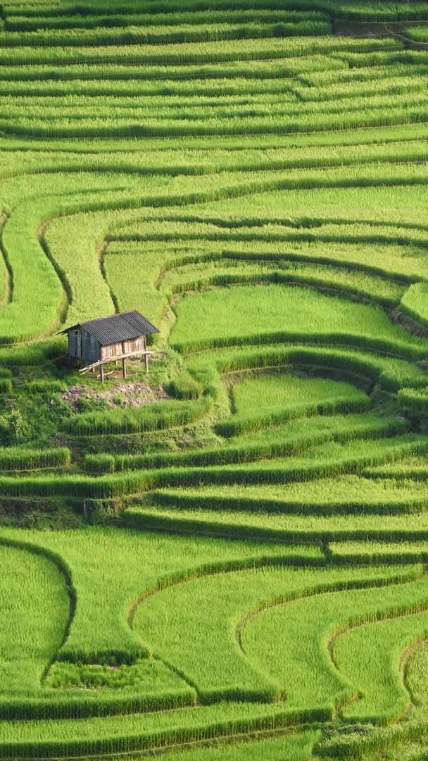 Au milieu des collines ondulantes de la province vietnamienne de Yen Bai, les rizières en terrasses du district de Mu Cang Chai forment une mosaïque de terres agricoles. Le peuple Hmong, une minorité ethnique réputée pour sa culture riche et ses vêtements colorés, a façonné ces collines en cascades depuis des générations. Les Hmong ont migré de Chine vers le nord du Vietnam au XIXe siècle. Ils pratiquaient l"agriculture itinérante, un système où les terres sont cultivées temporairement avant de retrouver leur végétation naturelle, pour des cultures telles que le millet, le riz, le maïs et l"orge.