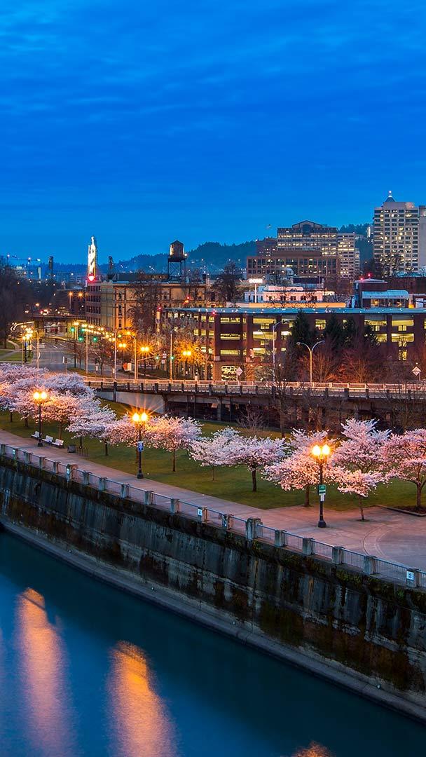 Calma, città e ciliegi Fiori di ciliegio al Tom McCall Waterfront Park, Portland, Oregon, USA (© Eric Vogt/Tandem Stills + Motion)