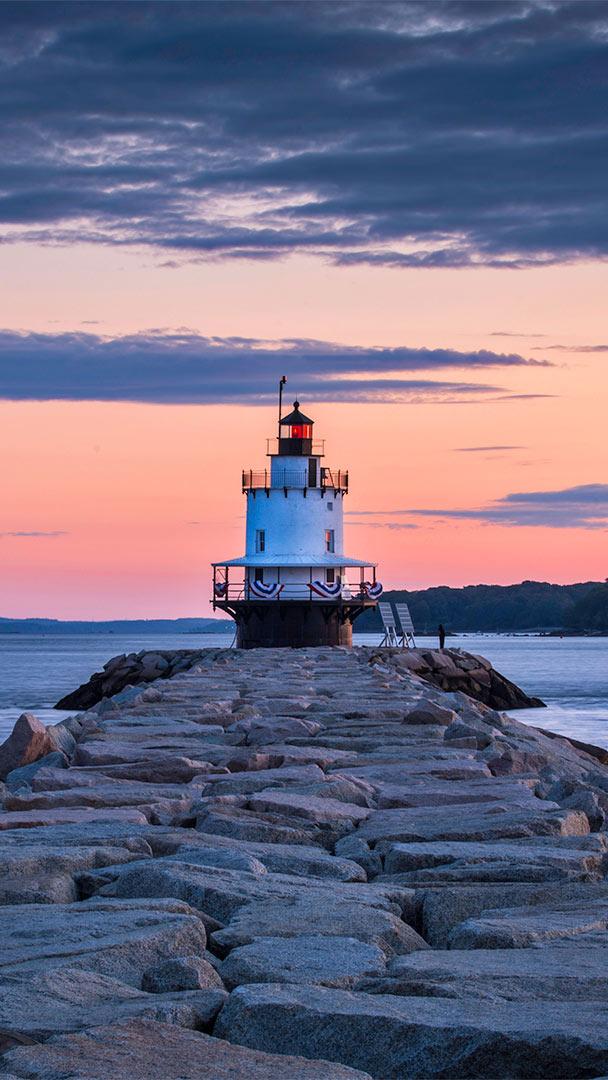 Un piccolo, ma potente guardiano Faro al tramonto a Portland, nel Maine, USA (© Haizhan Zheng/Getty Images)