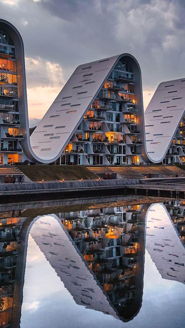 今日の画像は、デンマーク南部の港町ヴァイレにある「ザ・ウェイブ」。波形が特徴的なこの建物は、9 階建ての集合住宅であり、各棟には 20 戸の住戸が設けられています。デンマークを代表する建築家、ヘニング・ラーセンが設計したもので、2018 年に完成しました。住宅として機能しながら、自然環境と調和する造形が高く評価され、現代デンマーク建築を代表するランドマークとなっています。