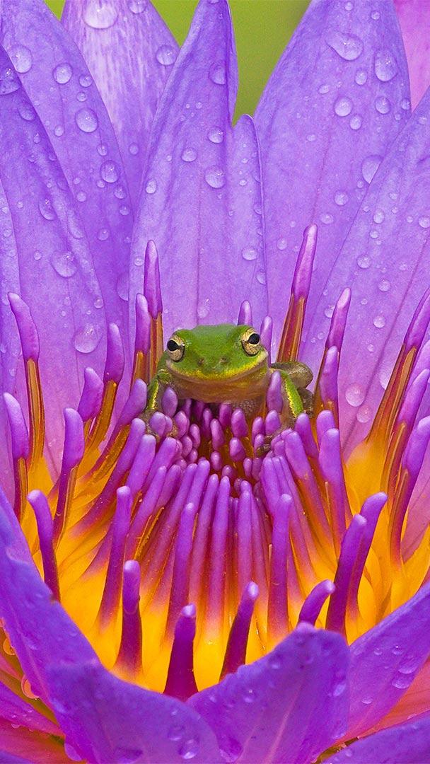 Perched among the petals of a purple water lily, we think this petite tree frog makes a fine mascot for National Frog Month. The annual event celebrates frogs around the world, all 4,000+ species. Among the various kinds, the little green tree frog is commonly found in the backyards and water features of the southeastern United States. It was named the official state amphibian of both Louisiana and Georgia. Not bad for a little tree frog who likes flowers.