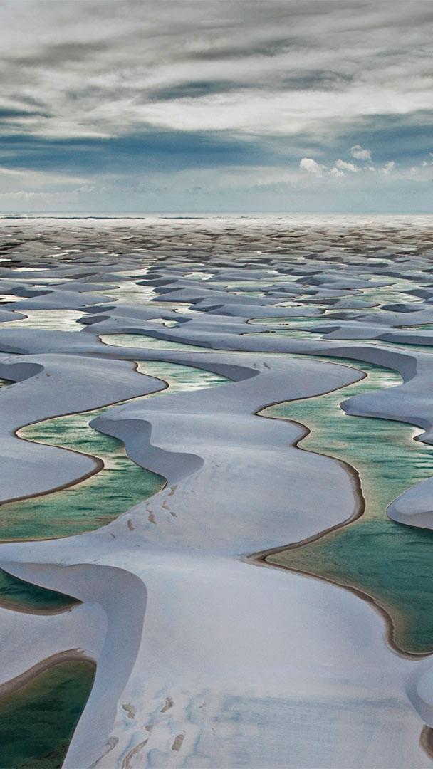 From the air, the mesmerizing tapestry of sandy dunes and lagoons you see here gives Lençóis Maranhenses National Park an otherworldly, desert-like appearance. Located in the sparsely populated northeast corner of Brazil, this park gets far too much annual rainfall—nearly 50 inches—to be considered a desert. In fact, heavy rain is part of what makes this place unique: Nearly 70% of its annual rainfall comes between January and May, filling the park"s nearly 40,000 lagoons to the brim with fresh rainwater. Why doesn"t the water sink into the sand? A layer of impermeable bedrock beneath the dunes prevents that from happening.
