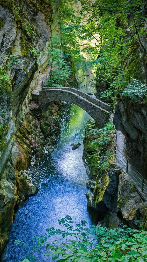 Although this stone bridge, known as Saut de Brot, looks right out of a fairy tale, it serves a very practical purpose. It connects walking trails on each side of the Areuse Gorge, offering safe passage to hikers exploring the lush Brot-Dessous area in western Switzerland, a predominantly French-speaking region of this multilingual country. It"s not known when the bridge was built exactly, though it"s thought to be a recent construction. But if that"s true, how do we not know who built it? All this mystery leads us to suspect it"s the work of helpful gnomes and fairies living deep in the Swiss woods. The end.