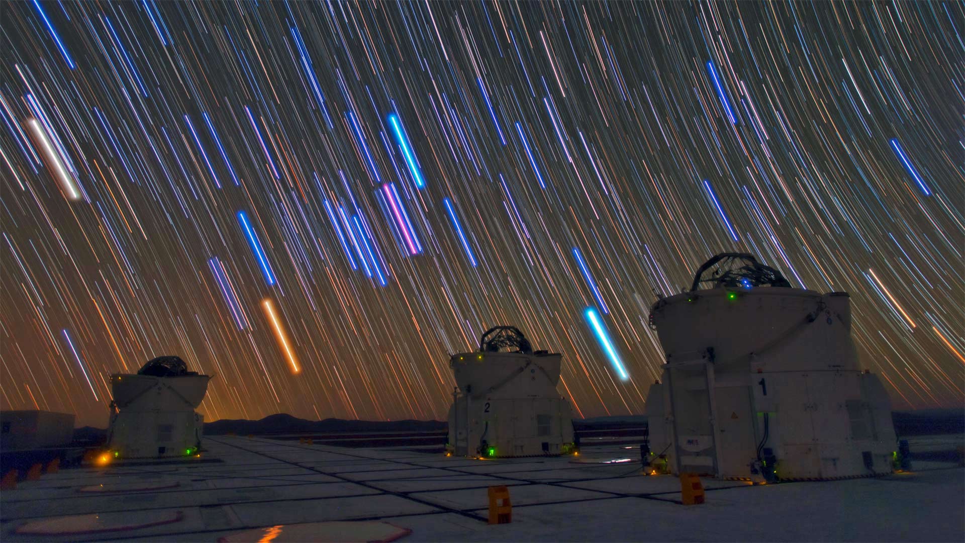 No, that"s not a downpour of lightsabers—but it"s no typical night sky either. Stargazing here at Paranal Observatory, on a mountaintop in Chile"s desolate Atacama Desert, you"ll get one of the clearest possible naked-eye views of the southern skies. This "lightsaber" effect comes from the photo"s long exposure: What we"re seeing is these stars" paths as they track across the night sky due to our planet"s rotation. The dazzling colors indicate temperature, from chilly red (5,000-ish degrees Fahrenheit) to balmy blue (temps in the tens of thousands).
