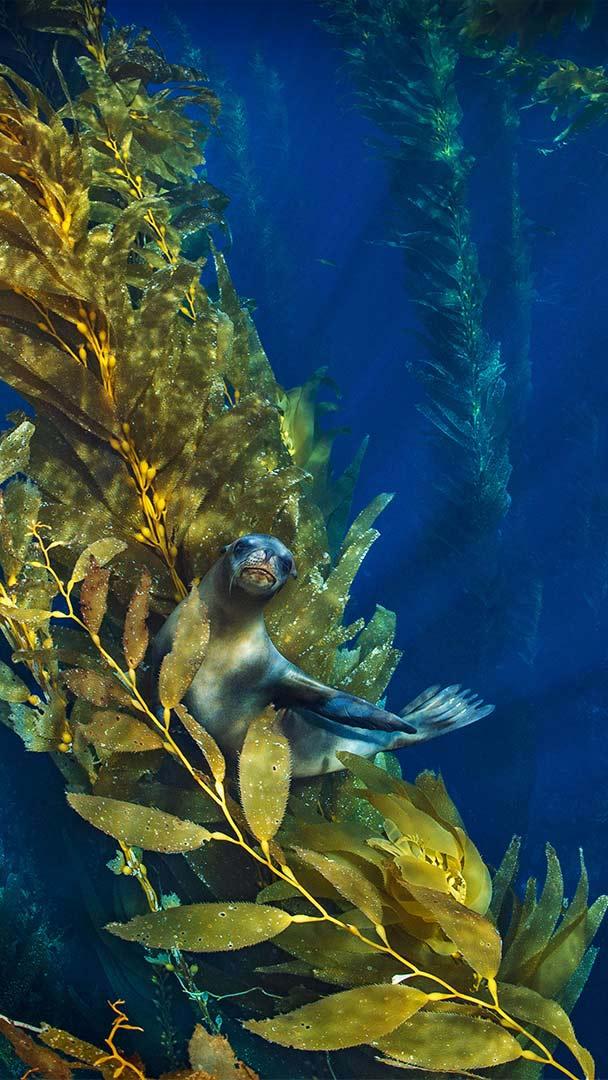 This California sea lion is peeking out from a kelp forest near the Channel Islands of California. Although this species is named for the Golden State, the California sea lion"s range stretches all along the western coast of North America, from central Mexico up to Southeast Alaska. They tend to live in shallow coastal areas, dining on squid, anchovies, mackerel, and more. Highly social and intelligent, California sea lions often congregate in large—and loud—colonies on beaches and rocky shores to breed and have their pups.