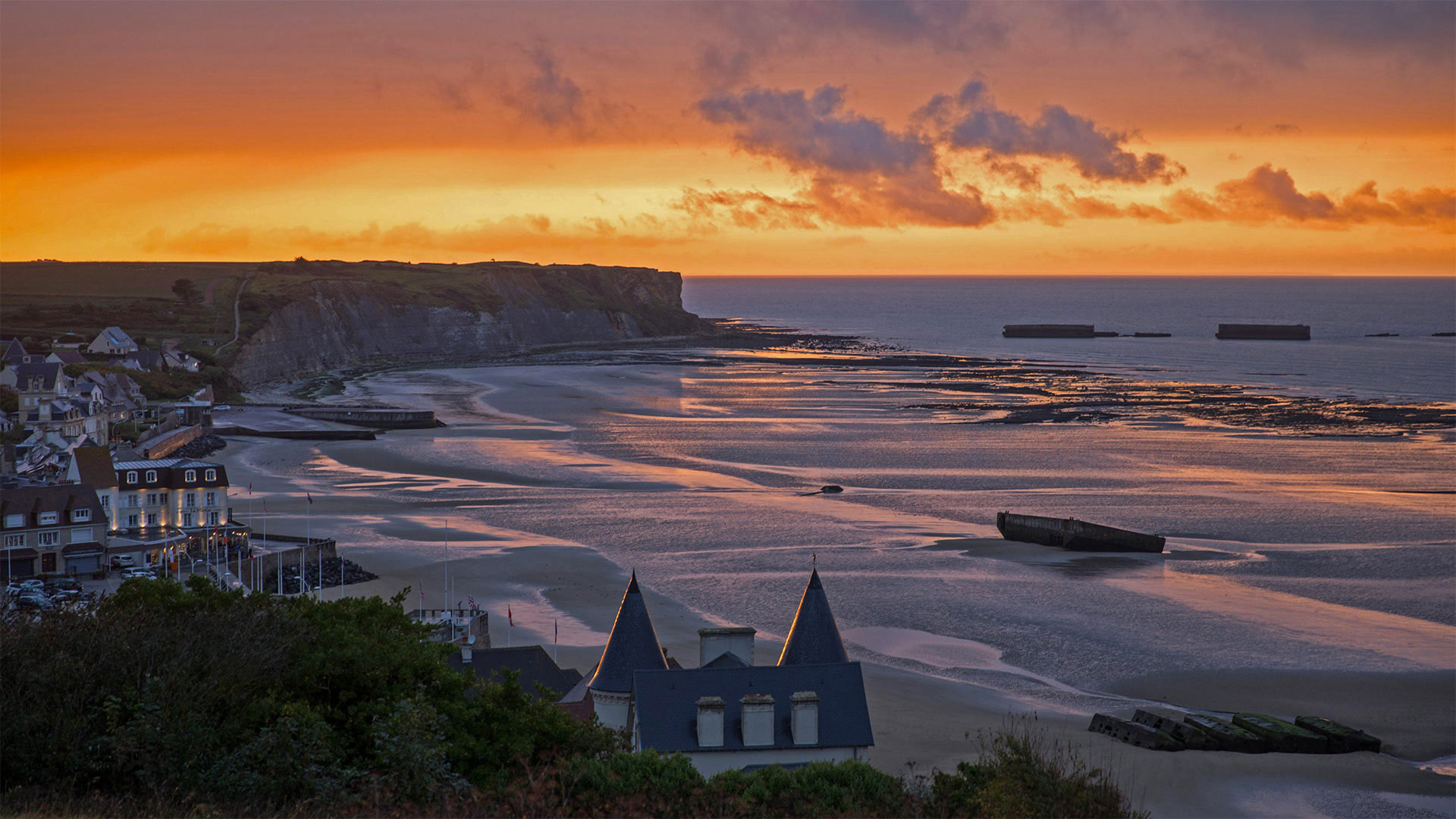 As the sun sets on a beach in Normandy, France, what appear to be working barges and boats offshore are actually the remnants of a Mulberry harbour, one of the temporary portable harbors created by the Allies during World War II. Their story began 77 years ago today, on D-Day, when the first of the Allied troops touched down on the Nazi-occupied beaches at Normandy. After the Allies successfully held the beachheads, the Mulberries were towed into place so the artificial harbors could provide the port facilities necessary to offload the thousands of men and vehicles, and tons of supplies necessary to sustain the effort to drive the Germans out of France.