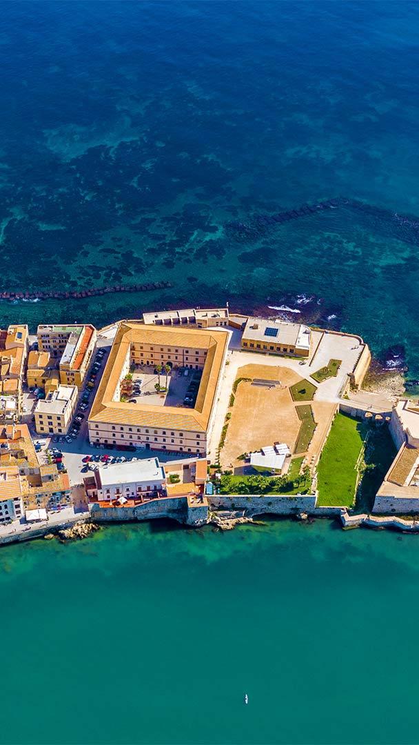 This bird"s-eye view lets us take in the charms of Ortygia, a small island just offshore from Syracuse, on Sicily"s east coast. Ortygia is considered Syracuse"s "old town" and the historical heart of the city. Two bridges cross the narrow channel that separates Ortygia from Syracuse. Ancient Greeks first colonized this island in the 8th century BCE, and the town is brimming with 2,700 years of history. Walk Ortygia"s web of narrow streets and you"ll see Greek and Roman ruins, medieval Norman buildings, and examples of Baroque architecture as well.