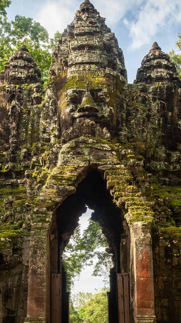 Towering temples, moss-covered ruins, and enchanting forests can all be found in the ancient site of Angkor in Cambodia, once the center of the powerful Khmer Empire. Pictured on our homepage is the North Gate of Angkor Thom, the "Great City" within Angkor, built in the 12th century. Strolling through Angkor Thom"s intricate ruins, gates, and Bayon Temple, with its 216 gigantic smiling stone faces, is like stepping into an adventure movie. Angkor"s star attraction, Angkor Wat, is the world"s largest religious monument—spread across 402 acres—and a masterpiece of Khmer architecture. It was initially constructed as a Hindu temple before becoming a Buddhist site. So, if you"re looking for a blend of history, art, and nature, this UNESCO World Heritage Site guarantees an unforgettable journey into the past.