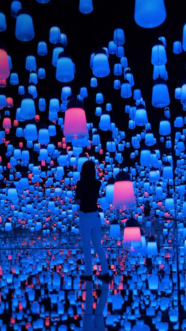 You’re looking at ‘Forest of Resonating Lamps,’ an art exhibit in the newly opened Mori Building Digital Art Museum in Tokyo’s Odaiba area, a manmade island in Tokyo Bay. The futuristic facility is making headlines this summer for its unique format. The venue features exclusively digital art–some 50 exhibits that are displayed throughout the 10,000-square-foot space to create an immersive, borderless experience. More than 500 computers and 470 projectors are used to create an ethereal effect. In "Forest of Resonating Lamps," hundreds of lamps dangle from the ceiling and light up in response to movement in the room.