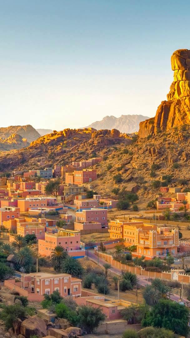 The nearly hidden valley town called Tafraout (sometimes spelled Tafraoute) and smaller settlement, Aguerd Oudad, are surrounded by the red hills of the Anti-Atlas Mountains, far from the larger cities in Morocco. The area is frequently visited by climbers who come to scale the nearby peaks, like this one, called Napoleon’s Hat (it’s thought to resemble the bicorne hat that Napoleon Bonaparte memorably wore sideways). The town is remote enough that tourists must make an effort to get there, but as many travel writers note, it’s well worth it. The villagers here lead a quieter, slower-paced life than those in Morocco’s bustling urban centers such as Marrakesh.